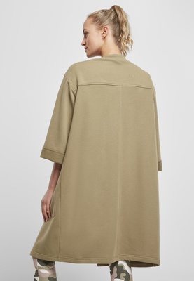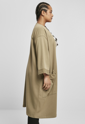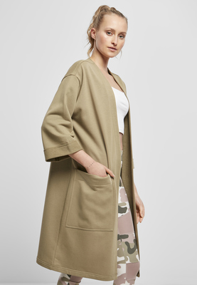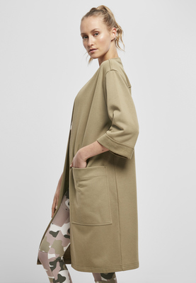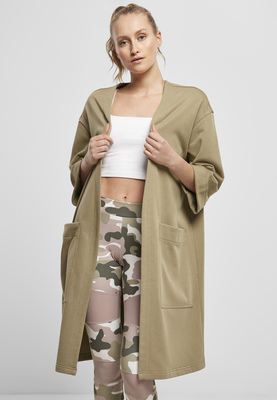 The wide and elongated women's cardigan has a casual oversize fit and is made from smooth terry cotton. It is open at the front and features two deep patch pockets. The wide sleeves reach slightly over the elbows and they have accentuated turned-up cuffs. The shoulder section on the other hand is emphasized by a prominent transverse seam at the back.