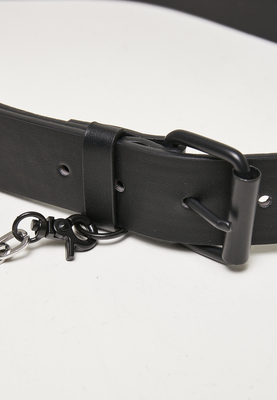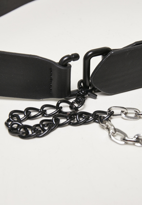 Equipped with a two-toned metallic chain that attaches to a belt loop via a clip this striking faux leather belt makes a fashionable contribution to the urban wardrobe. The style is rounded off by an S-shaped link, integrated into the belt. It adjusts via a handy pin buckle and is available in two different sizes. The employed material is sturdy polyester.