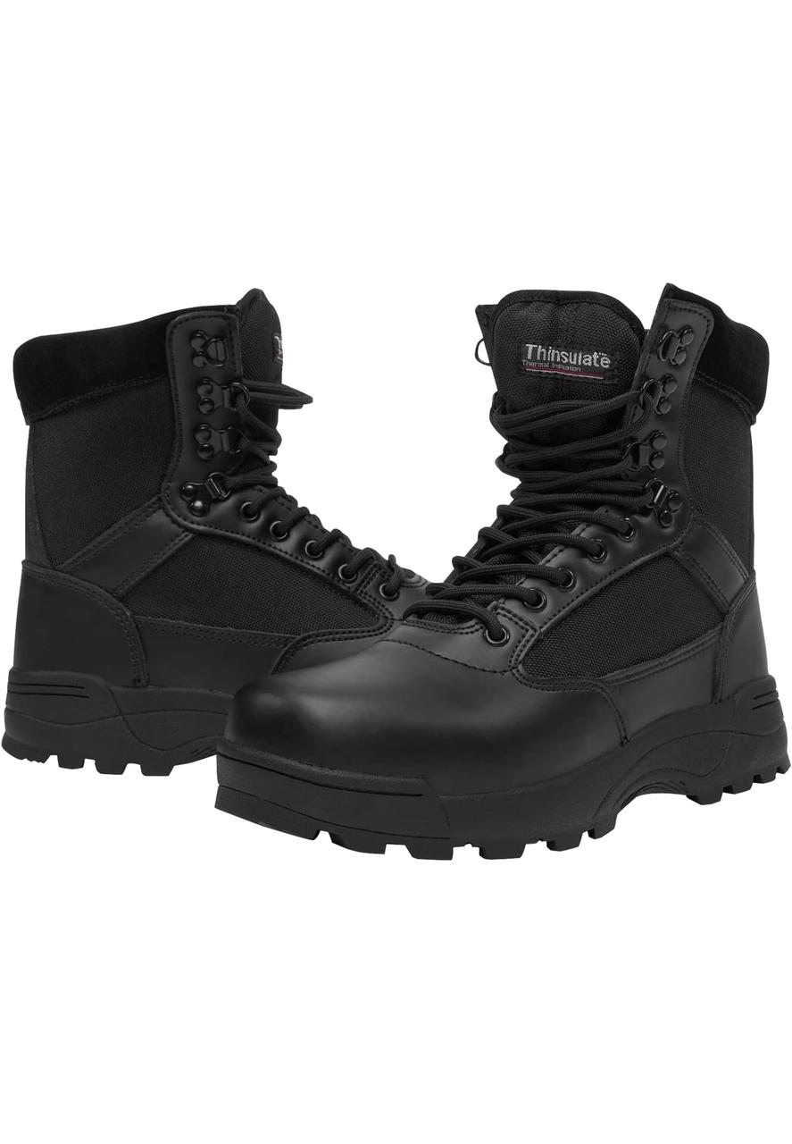 An unpretentious boot made of nylon and synthetic leather, which satisfies with a solid look and high functionality. The rubber sole offers you a strong profiled grip, even on slippery ground, and convinces with silent performance as well. The ankle stays stabilized by the high upper of the boot and the neat lacing arrangement. Thanks to the integrated zipper you can quickly slip in and out. Furthermore, even in cold weather these tactical boots stay reliable and comfy footwear: a special Thinsulate insulation will keep your feet securely warm.