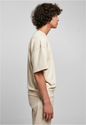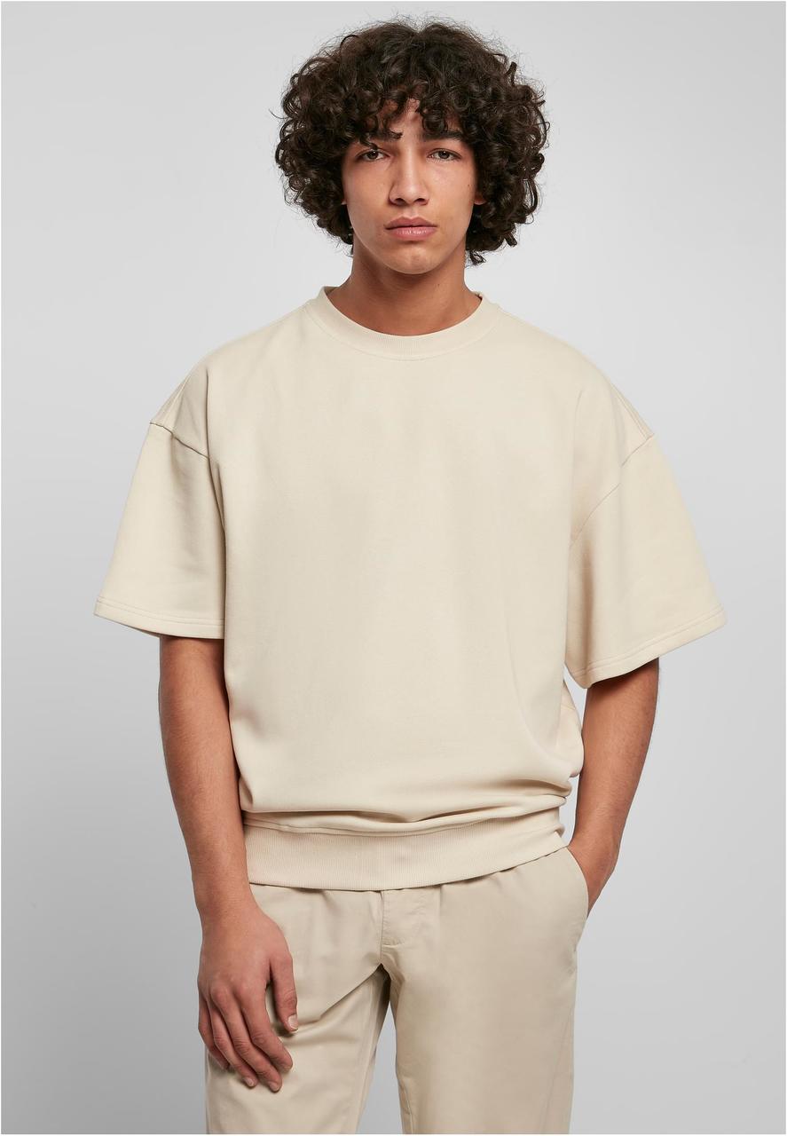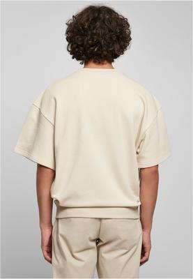 The single-colored shirt for men is a successful mix of sweatshirt and T-shirt short sleeves and an accentuated rib crew neck combined with a wide rib hem and smooth terry sweat wear. With a slightly shorter cut than regular and an oversize / boxy fit with an angular silhouette and wide shoulders trendy urban style is ensured.