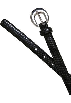 A slim women's belt with a snakeskin look that is an authentic fashion piece and is complemented by a round pin buckle. It is made of polyester and available in the lengths of 105 cm and 125 cm.