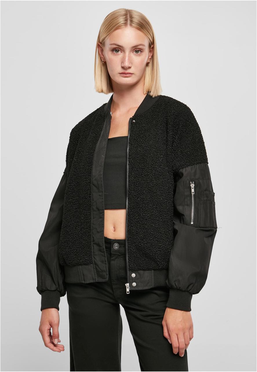 The ladies bomber jacket presents an exciting material mix of Sherpa fabric and twill. The left sleeve offers the style inherent zip pocket a typical bomberjacket feature. The front zipper hides under a contrasting colored facing and the outlines of the side pockets are accentuated as well. Wide, elastic rib cuffs on sleeves and hem as well as a subtle stand-up collar of the same material round off the look. The women's bomber jacket is a comfy oversized fit.