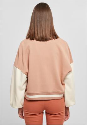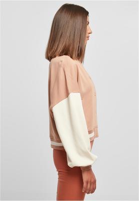 The succeeded ladies two-tone college jacket satisfies to the fullest. The knit cuffs on hem, collar and sleeves are styled in two different colors and give the jacket its college appeal. The two pockets of the jacket feature snap buttons as well as the main front closure. The wide sleeves gather at the cuffs and provide an additional feminine touch. Lastly, an oversized fit with matching, dropped shoulders ensure a fresh and trendy design finish.