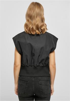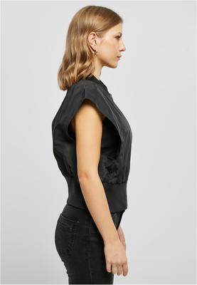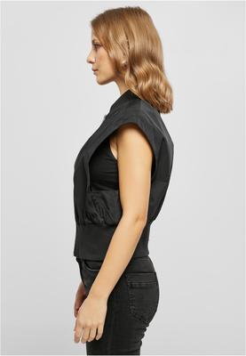 Determined, strong and confident: this recycled Bomber Vest is a vital piece for women, who know who they want to be. The fit is oversized and the arms remain free. The succeeded V-neckline clearly emphasizes both back and shoulders. Furthermore, an extra wide rib hem enhances the design at the lower end, while a metallic zipper with zig-zag quilting on the inside as well as a taffeta lining complete the impressive bomber vest. A must-have piece of fashion made from recycled fabric!