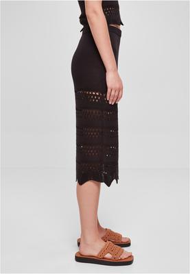 This charming crochet knit skirt is divided into two areas. The upper part with the length of a mini skirt is opaque, thanks to a respective knit pattern. Underneath, an elegant crochet pattern falls down in a 3/4 length over the knees and finishes with a skillful wave form. The employed material is fine acrylic. The cut is a comfy slim fit.