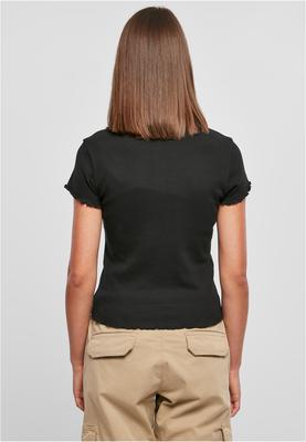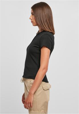 This cute women's top offers a ruffled look at polo collar, hem and sleeves. A short button placket compliments the polo collar, while the fit is a relaxed slim cut. The used material is pure cotton, infused with a small amount of elastane.