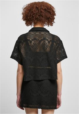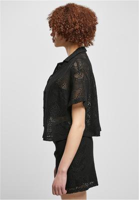 The short-sleeved blouse made of transparent lace enchants with feminine sophistication. It is equipped with a lapel collar and a button placket and ends just above the hips. Urban appeal derives from the loose fit of the shirt with dropped shoulders. The resort shirt is made of comfy cotton and polyamide.