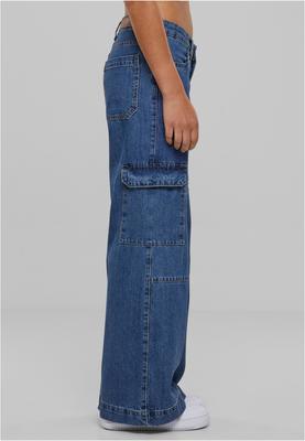 The women's cargo pants are made of robust cotton denim. They feature wide and straight legs with cargo pockets and inlets at the knees. Side pockets and patched back pockets complete the outline. The women's cargo pants are low-cut and sit comfortable on the hips. They are a loose fit.