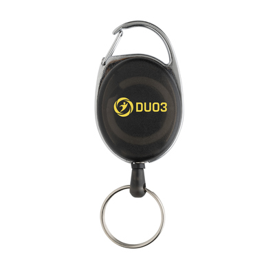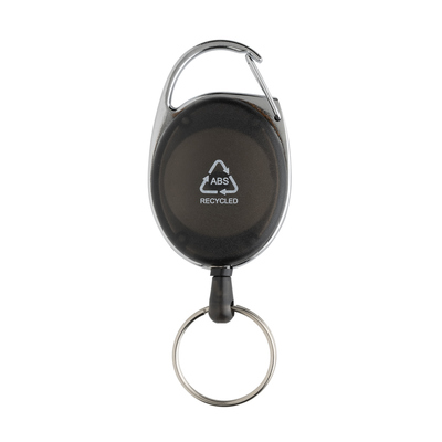 Roller clip keychain made with RCS recycled ABS and zinc alloy. Ideal item for office, trade show or even when skiing. With 60cm cord to attach badge for easy access. With carabiner hook to attach to bag or clothing. Total recycled content: 34% based on total item weight. RCS certification ensures a completely certified supply chain of the recycled materials. Packed in paper bag.
