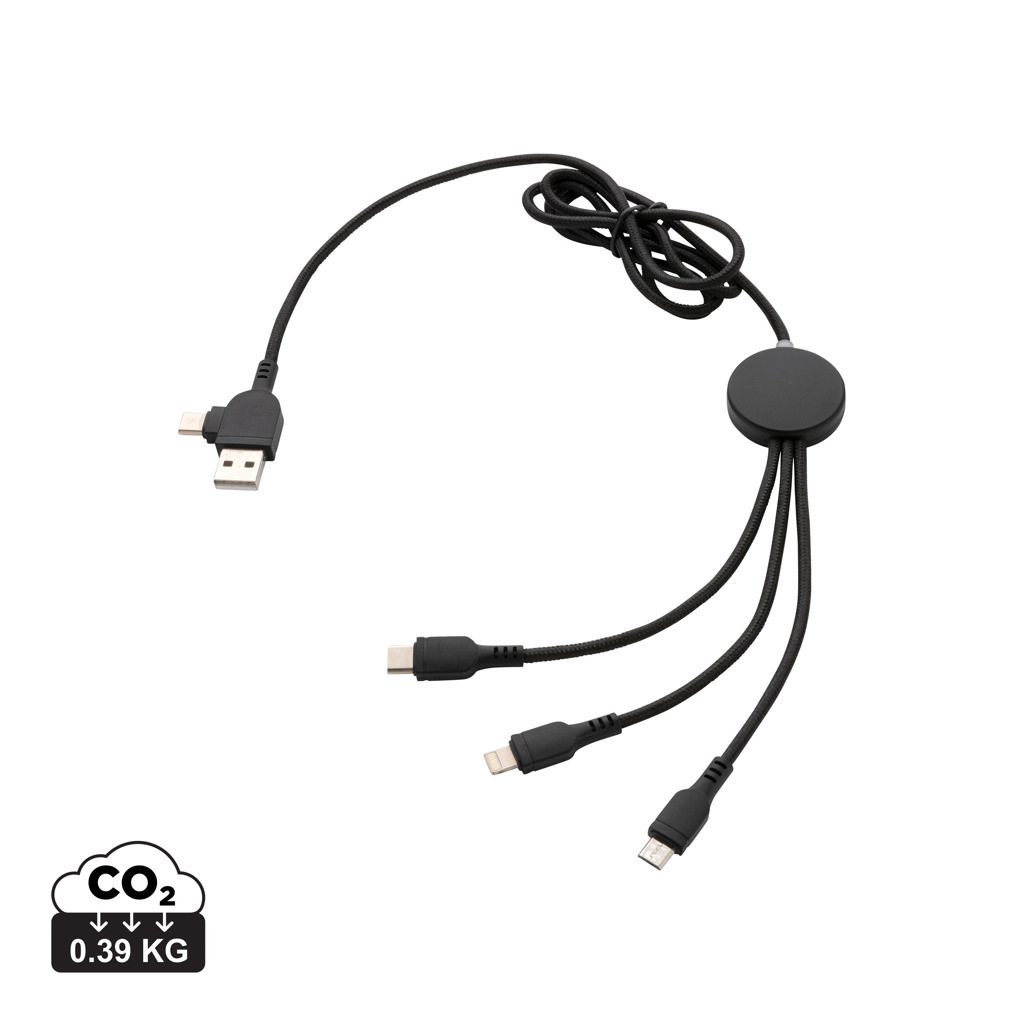 Braided nylon multi cable with 5 different connectors: USB C in, USB A in, type C out, IOS out and micro USB out. This allows you to use the cable also with type C output devices that are included in the newer generation of phones and macbook computers. The cable also has a USB A output input option so it can charge any device from any output source. ABS casing with option to engrave your logo that will light up when the cable is being used. PVC free. Lenght 120 cm.