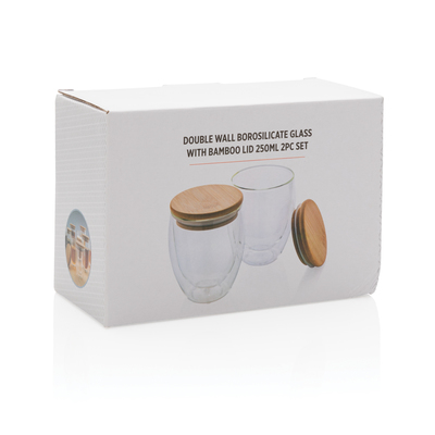 This double wall borosilicate glass set has a sleek 2 layer design which showcases all your favourite drinks! No matter what you serve, cappuccino, tea or latte will be nice and hot while your hand stays cool. Incudes a bamboo lid. It is recommended to handwash the glass and bamboo lid. Presented in a full colour gift box. Capacity per glass 250ml. BPA free.