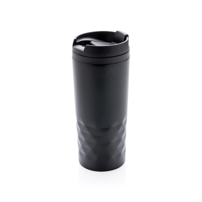 Fashionable stainless steel tumbler with geometric details. Inner body is made out of plastic. Handwash only. Content 300ml.