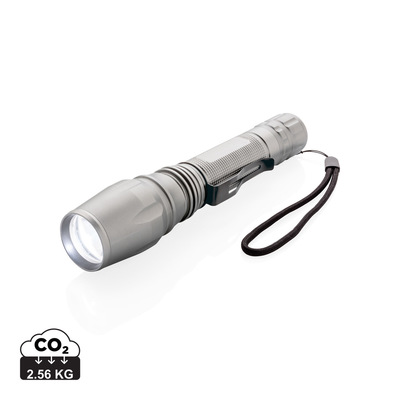 Super bright and tough 10W CREE led torch that can handle even the most difficult conditions. The durable aluminium torch is IPX 4 waterproof and shockproof up to 1 metre drop. The beam of the torch can be adjusted to focus or to light up a bigger area. With belt clip for carrying the torch. 250 lumen and working time of 6 hours. Includes batteries for direct use.
