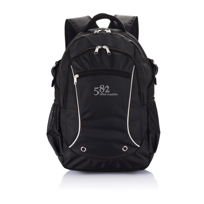 1680D and jacquard backpack. Zippered front pocket with organiser. Zippered main compartment with 15,6” padded laptop pocket. Reflective piping. Two side mesh pockets. PVC free.