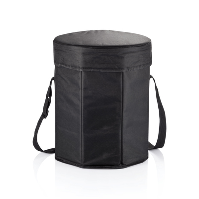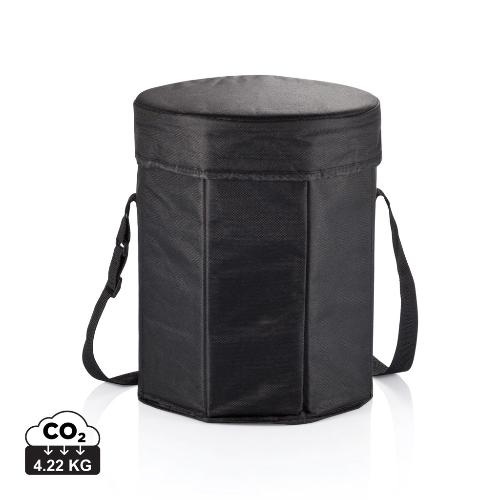600D polyester in black with PE coating, 30cm diameter, foldable. Usable as cooler and seat.