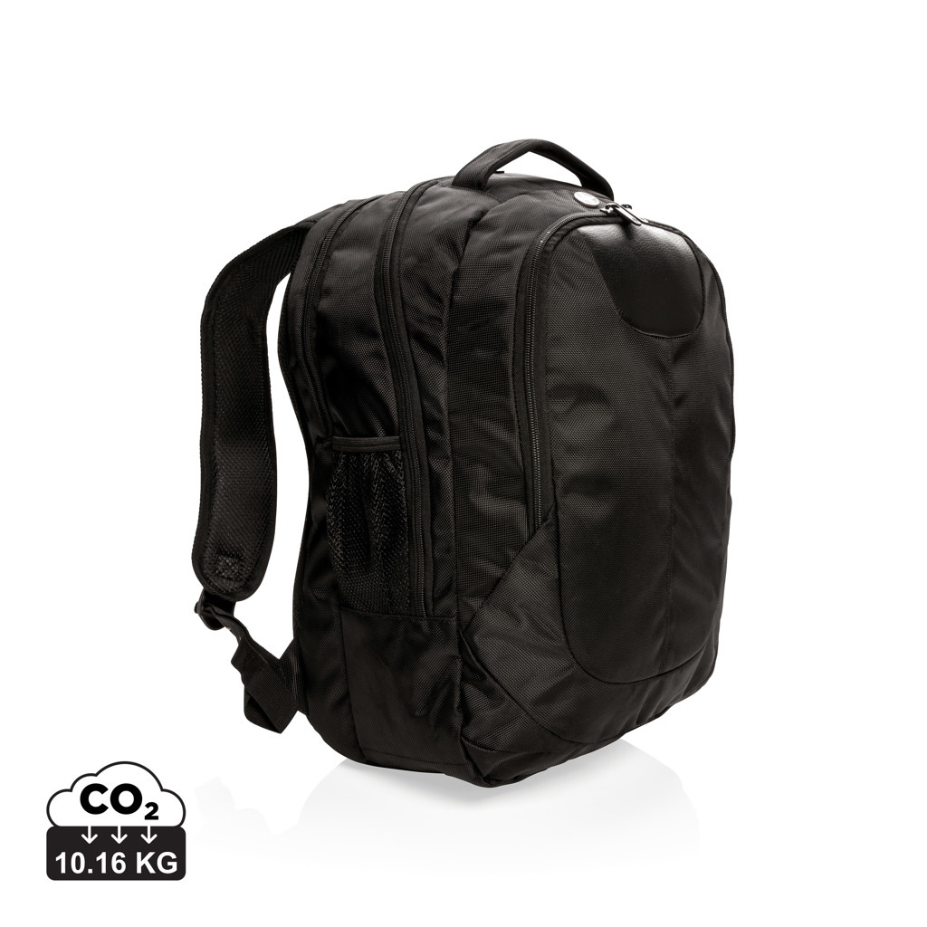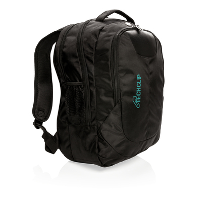 1680D polyester laptop backpack with unique balance between comfort and outdoor protection. The backpack has pockets for all your necessities from padded laptop compartment and iPad holder, to pen loops and mesh pockets. On the shoulder strap there is an audio jack to connect your headphone and a sunglasses carrier. It even has a rain cover to protect it all. Registered®