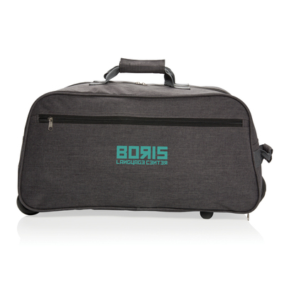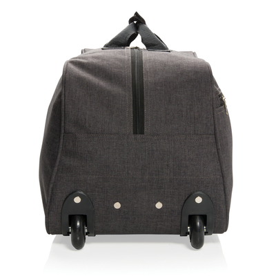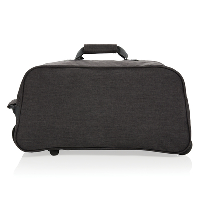 600D high density extra strong two tone polyester fabric. With extendable trolley system. One front pocket and one zipper closure main compartment.