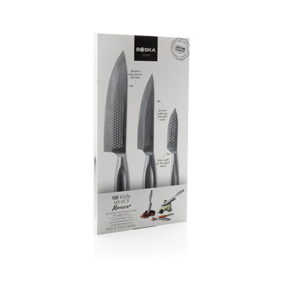 The Monaco+ kitchen knives set, from the brand BOSKA – a B Corporation certified company – is the ultimate set for every food lover. With the same features as the knives for professionals; high-quality stainless steel, extra sharp, and the slender handle for full control of the knife. Cooking Knife - for cutting everything! Sous Chef Knife – because what is a Chef without a Sous Chef. Paring Knife - for cutting vegetables and fruit. This set is handwash only, and backed by a lifetime guarantee.
