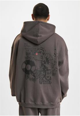 This hoodie combines a relaxed oversized fit with a detailed graphic design. While the front features a subtle logo print on the chest, the back showcases a large-scale artistic illustration. The design blends classical statue motifs with musical elements such as a vinyl record and a gramophone, complemented by bold lettering. Dropped shoulders, a classic kangaroo pocket, and elasticated ribbed cuffs at the sleeves and hem emphasize the urban streetwear character of this piece.