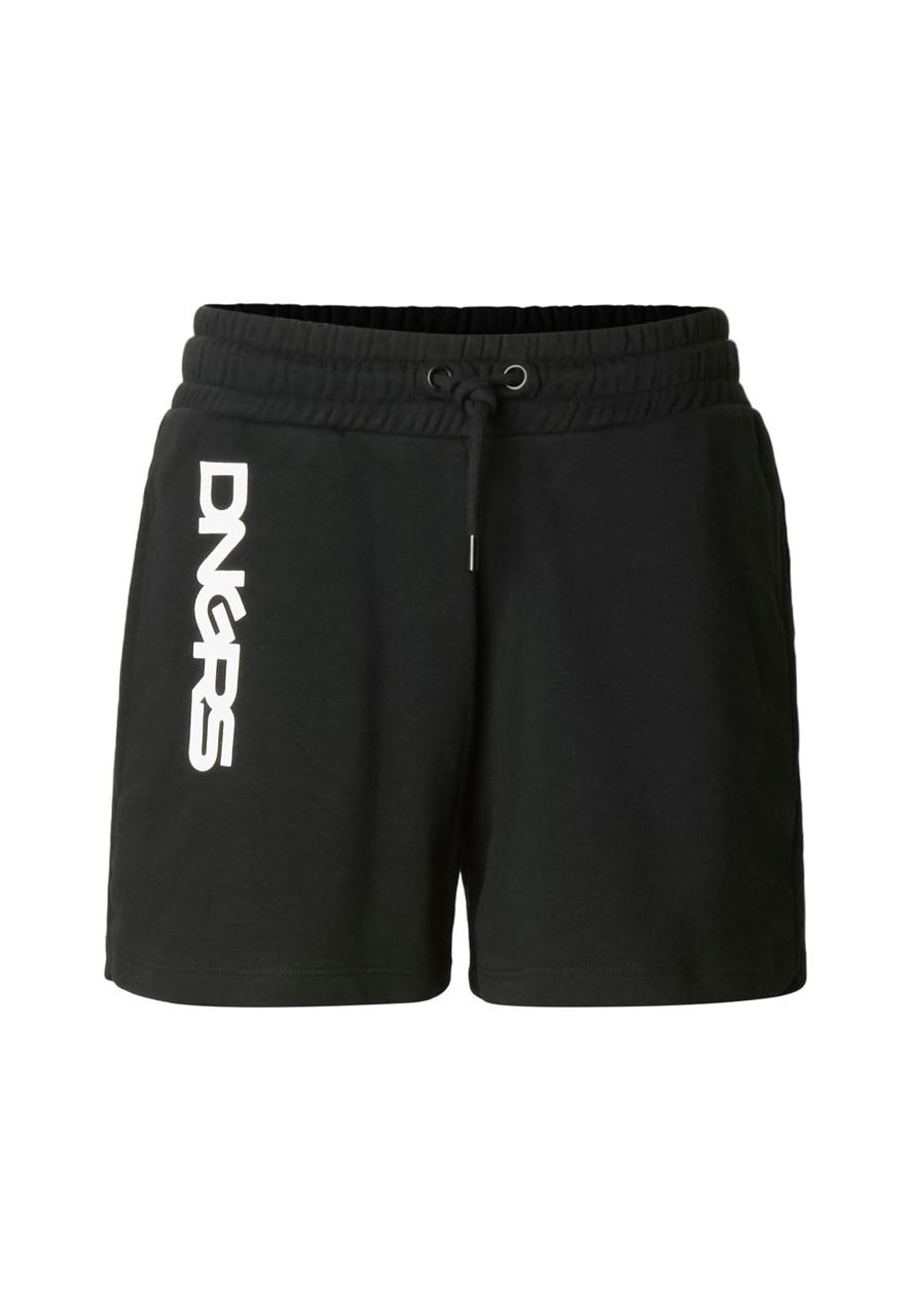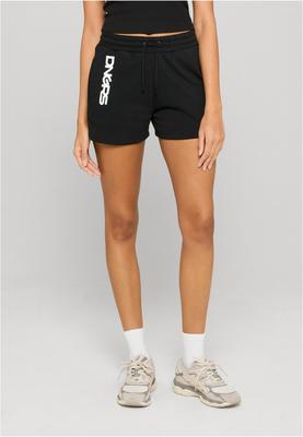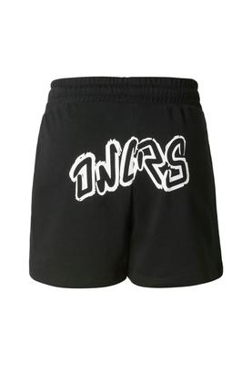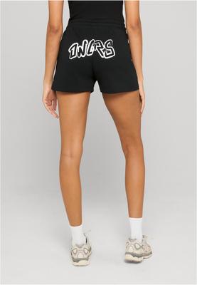 These black sweat shorts feature a striking white contrast panel on the right leg, accentuated by vertical graffiti-style lettering. An elastic drawstring waistband with white cords ensures a custom fit, while side pockets and a small logo detail on the back complete the functional design.
