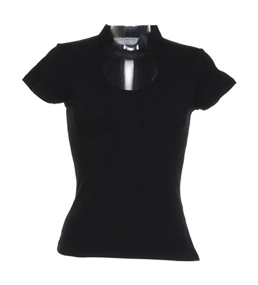 ·Tiefes rundes Decolletée mit schmalem Bündchen eingefasst und Stehkragen
