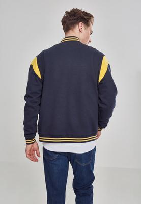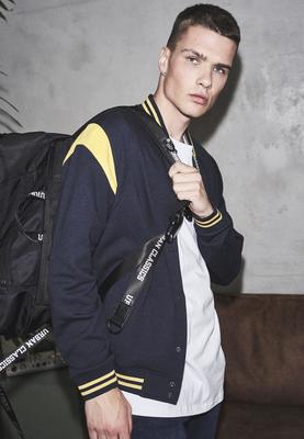 This stylish college jacket has all the typical features, but is made of comfortable sweatshirt fabric and complements any outfit. One highlight is the matching stripes that perfectly complement the ribbed collar and the elastic ribbed cuffs in a college look. The matte metal snaps, which also adorn the side pockets, are an additional highlight.