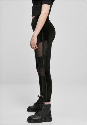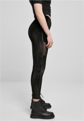 These hot and spicy leggings rely on their sophisticated material mix of shimmering stretch velvet and transparent mesh. The mesh inserts on the thighs and knees definitely allow for seeing the underlying skin. The supple velvet material contrasts excellently with the mesh. Naturally, the leggings fit like a second skin. They cut is low and for an optimum fit the waistband stays elastic.