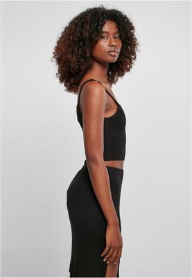 The straightforward ladies' top made of finest knitwear is without a doubt a succeeded fashion it-piece. Its angular and deep cutouts at the cleavage and the back are framed by fine straps. The cropped length fits right into the design. The women's knit top is made of polyacrylic, viscose and nylon and has a slim fit.