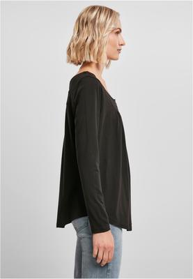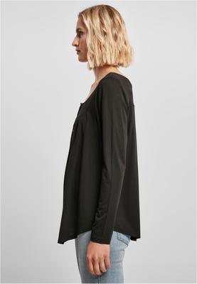 The long-sleeved shirt for women is made with sophisticated details and ensures plenty of style variety. It has a wide rounded neckline that ends in a short button placket. With a fine dividing seam the feminine shirt gathers above the chest. The low neckline on the back is accented with an additional cross seam. The shirt falls wide and softly over the wearers body, while the sleeves facilitate a tighter fit. The allover casual and elegant style is rounded off by a rounded hem and an elevated side seam. The ladies' top is made of a pleasant material mix of cotton and viscose.