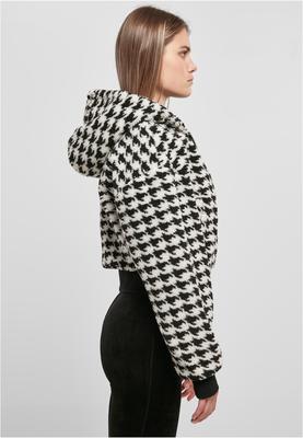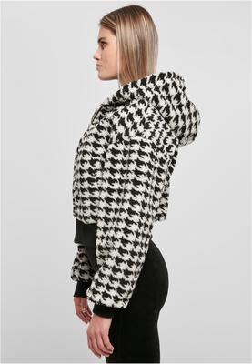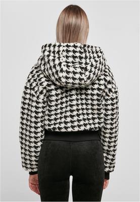 This bold ladies jacket is a proper fashion highlight and features a short yet oversized cut and a large hood. Its fluffy Sherpa material and allover pattern are hip details. Furthermore, the jacket is equipped with side pockets and fastens via a metallic zipper. Other details are its wide, contrasting rib cuffs on sleeves and hem as well as its taffeta lining on the inside that provides additional wearing comfort.