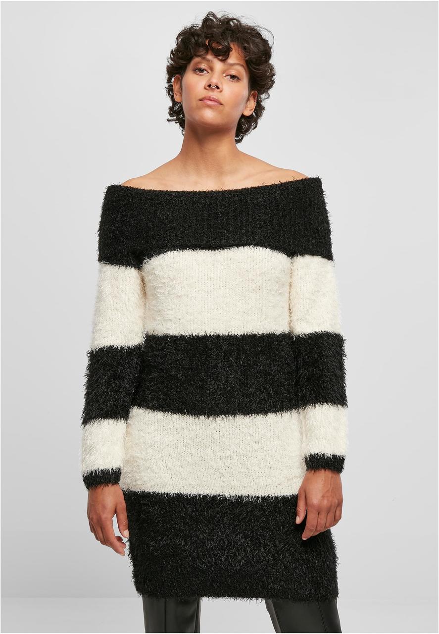 An off-the-shoulder dress with a fancy block stripe design, mini length and large turn-down collar. The material consists of a trendy feather yarn that perfectly matches with the ribbed knit cuffs on sleeves and hem, which complete the look. The dress is a regular fit.