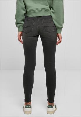 The body-accentuating ladies denims feature a medium-high waistband and a classic, tight slim fit cut. They are equipped with side and back pockets and are made of cotton with organic content and elastane.