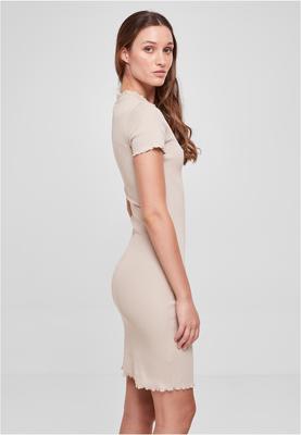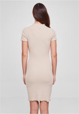 Dress designed for everyday wear, this slim-fit rib tee dress offers a body-skimming silhouette with a round neckline and short set-in sleeves for a clean, streamlined look. Constructed from a cotton rib jersey with a touch of stretch, it feels close-fitting yet comfortable and moves with the body. Delicate ruffled trim accents the neck, sleeve hems and skirt hem for subtle texture, while a right-to-left closure maintains a smooth front profile. The knee-length cut and minimal seaming create an uncomplicated layer that works from daytime errands to casual evenings, and the fabric’s natural handfeel keeps care straightforward for regular use.