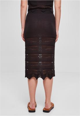 This charming crochet knit skirt is divided into two areas. The upper part with the length of a mini skirt is opaque, thanks to a respective knit pattern. Underneath, an elegant crochet pattern falls down in a 3/4 length over the knees and finishes with a skillful wave form. The employed material is fine acrylic. The cut is a comfy slim fit.