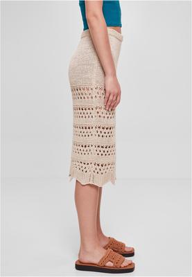 This charming crochet knit skirt is divided into two areas. The upper part with the length of a mini skirt is opaque, thanks to a respective knit pattern. Underneath, an elegant crochet pattern falls down in a 3/4 length over the knees and finishes with a skillful wave form. The employed material is fine acrylic. The cut is a comfy slim fit.