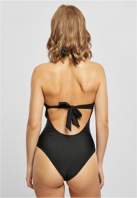 This swimsuit is ideal for any day at the beach, the lake or the pool. Thanks to the slim fit, it clings perfectly on the body and emphasizes the natural female lines. The highlight of the swimsuit is the low back cut, which is supported by a neckholder and an additional low placed ribbon. With a divider under the bust an even better fit is ensured. A pleated triangle bustier provides the final touch. The swimsuit is made mostly from recycled polyester and offers removable cups, too.