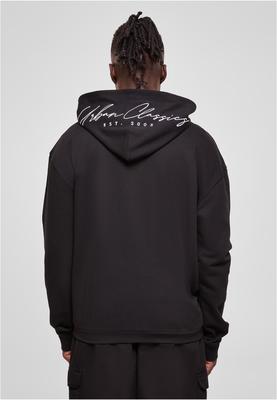 The single-colored men's hoodie satisfies with an elaborate and style-conscious Urban Classics embroidery on the back of the hood. Other strong features include a kangaroo pocket and wide cuffs on sleeves and hem. A comfortable oversize fit with dropped shoulders rounds off the look in a relaxed fashion. The sweater is made of a heavy cotton fabric.