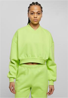The women's sweater presents a V-neck in combination with a cropped cut. Sporty accents are set by wide rib cuffs on sleeves and hem. The look is rounded off by a casual oversize fit with generously dropped shoulders. Also, the smooth brushed fleece fabric provides finest wearing comfort.
