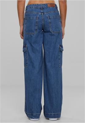 The women's cargo pants are made of robust cotton denim. They feature wide and straight legs with cargo pockets and inlets at the knees. Side pockets and patched back pockets complete the outline. The women's cargo pants are low-cut and sit comfortable on the hips. They are a loose fit.