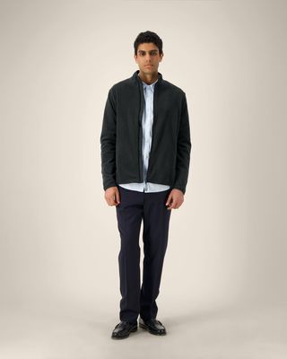 Recycled elastic binding at collar edge, sleeve cuffs and hem
