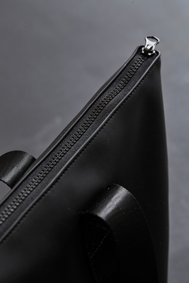 A small, sleek bag made of a lightweight, water-resistant nubuck PU fabric with a stylish matte exterior and a lightweight synthetic fabric interior. The main compartment closes with a zipper. Sturdy handles so you can fill the bag properly.