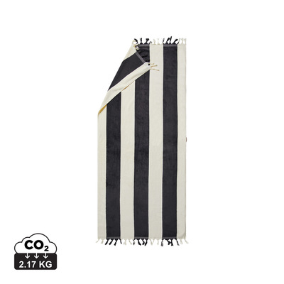A luxurious cotton beach towel with tassels at the short ends, for days at the beach or pool. Our beach towels are made in India with cotton, and have a thickness of 450 g/m2. OEKO-TEX® STANDARD 100. 09.HIN.68091. Hohenstein HTTI.