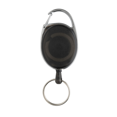 Roller clip keychain made with RCS recycled ABS and zinc alloy. Ideal item for office, trade show or even when skiing. With 60cm cord to attach badge for easy access. With carabiner hook to attach to bag or clothing. Total recycled content: 34% based on total item weight. RCS certification ensures a completely certified supply chain of the recycled materials. Packed in paper bag.