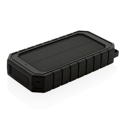 Fast 10.000 mah 10W wireless charging solar powerbank made with RCS (Recycled Claim Standard) certified recycled ABS and TPE. Total recycled content: 30% based on total item weight. RCS certification ensures a completely certified supply chain of the recycled materials. The powerbank supports both charging via cable (type C and USB) as via the 10W wireless fast charger. Wireless charging compatible with all QI enabled devices like Android latest generation, iPhone 8 and up. It has a solar panel along with a flashlight and a carabiner clip to attach to any bag. IPX5 Waterproof. With remaining battery indicator. Including type C charging cable made from GRS certified recycled TPE. Packed in FSC® mix kraft box. USB Output: 5V/2.4A; Type C Output: 5V/2.4A .Item and accessories 100% PVC free