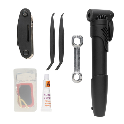 Luxury bike repair set in 600D pouch. The set contains 6pcs rubber repair patches, 1 pc tinplate grater, 2pcs latex valve tubes, 1pc glue, 2pcs nylon lever, 1pc aluminum alloy bone wrench, 1 pc carbon steel 16-in-1 multi tools, 1 nylon Pump. The 16 in 1 wrench includes: Hex wrench 2mm/2.5mm/3mm/4mm/5mm/6mm each; socket wrench 8mm/9mm/10mm each; Slotted Screwdriver, Phillips Screwdriver, Socket Extension Rod,; flat wrench 8/10/15/mm, spoke wrench/14GE.