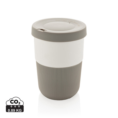 A sustainable alternative to traditional cups! Bringing style and practicality to your morning commute, this PLA coffee cup is ideal for transporting your favourite hot beverage. Manufactured from plant material (PLA), so not only stylish but also kind for the planet. Comes with a silicone grip and lid for your convenience. 100% melamine free. Capacity 380ml.
