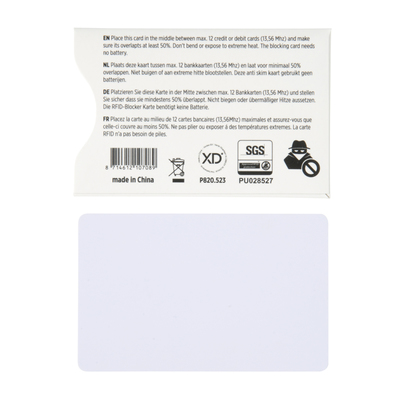 Make any wallet, purse or money clip RFID & skim safe. This card draws energy from NFC/RFID scanners to power up and instantly creates an electronic field making all 13.56 Mhz cards invisible to the scanner. No battery needed. 24/7 protection by patented E-field technology against electronic pickpocketing. NFC (13.56 MHz) Blocking.