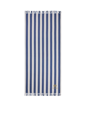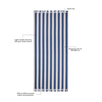 This hammam beach towel features a classic two-coloured striped pattern with fringes on the short sides. Crafted from a lightweight and airy 200 gsm blend, it combines the comfort of cotton with the quick-drying benefits of polyester. Measuring 80x180 cm, it is perfect for the beach or poolside. Certified by GRS (Global Recycled Standard), GRS certification guarantees that the entire supply chain of the recycled materials is certified. The total recycled content is based on the overall product weight. This product contains 68% GRS certified recycled cotton and 29% GRS certified recycled polyester.