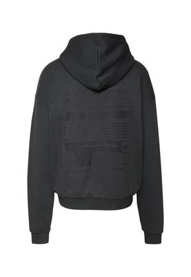 This hoodie combines a modern, relaxed fit with striking design elements. A key highlight is the large-scale, tonal graphic on the back, featuring a subtle texture that adds depth to the garment. Dropped shoulders and a double-layered hood emphasize the contemporary oversized silhouette. Completed with a classic kangaroo pocket on the front and elasticated ribbed cuffs and hem, this piece offers maximum comfort and a well-defined shape.
