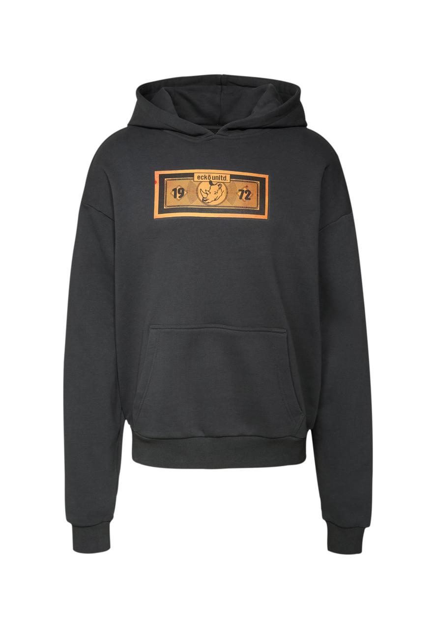 This hoodie stands out with its striking box graphic print on the chest, which features brand branding and a central vintage-style motif. The design is complemented by dates and a bold border. The hoodie has a modern, relaxed fit with dropped shoulders and a cozy hood. A spacious kangaroo pocket on the front provides practical storage, while elasticated ribbed cuffs and hem ensure a comfortable fit. The textile is durable and holds its shape for long-lasting wearing comfort.